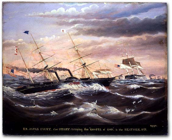 視線を日本に向けてみよう。藤幡がスクリーンに提示したのは、ペリー来航を描いた二枚の絵だ。一枚は随行画家による写実的な艦隊の記録画、もう一枚は日本人が描いた、まるで怪獣のような蒸気船の浮世絵である。